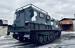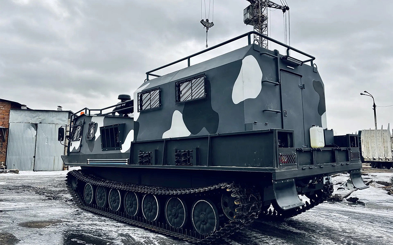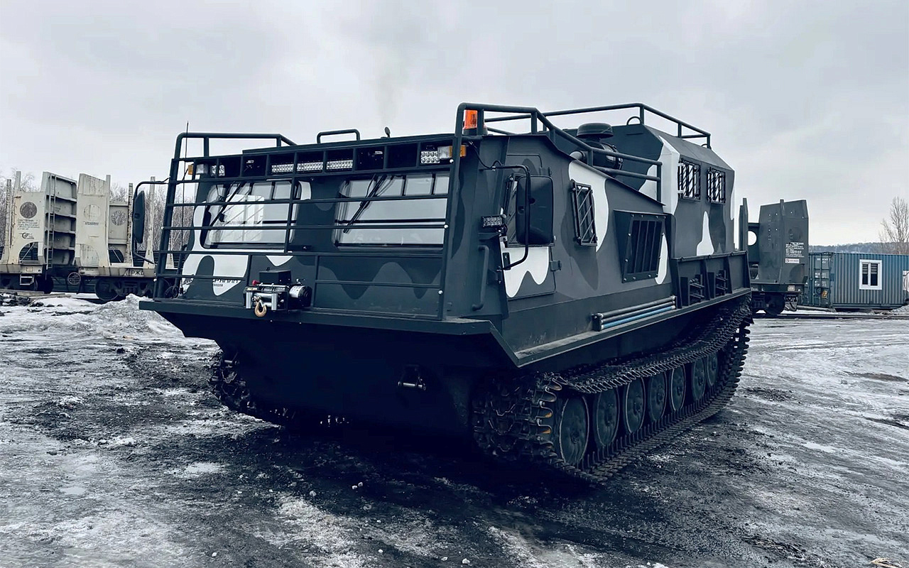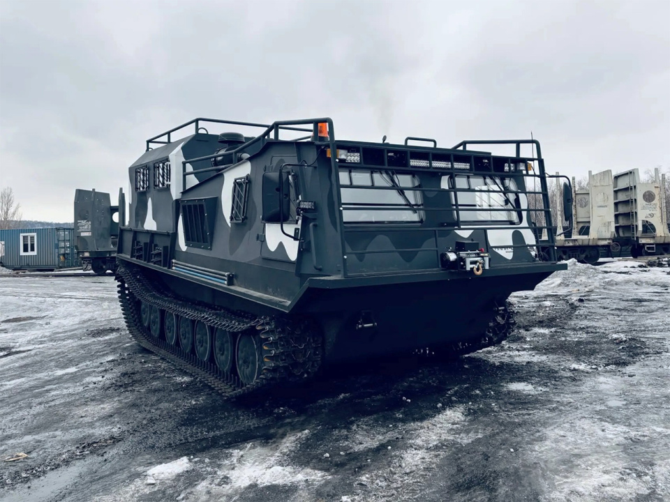 Модернизированный грузопассажирский вездеход на смену устаревшим армейским МТЛБу. Предназначен для перевозки людей и различных грузов в сверхтяжелых условиях бездорожья.