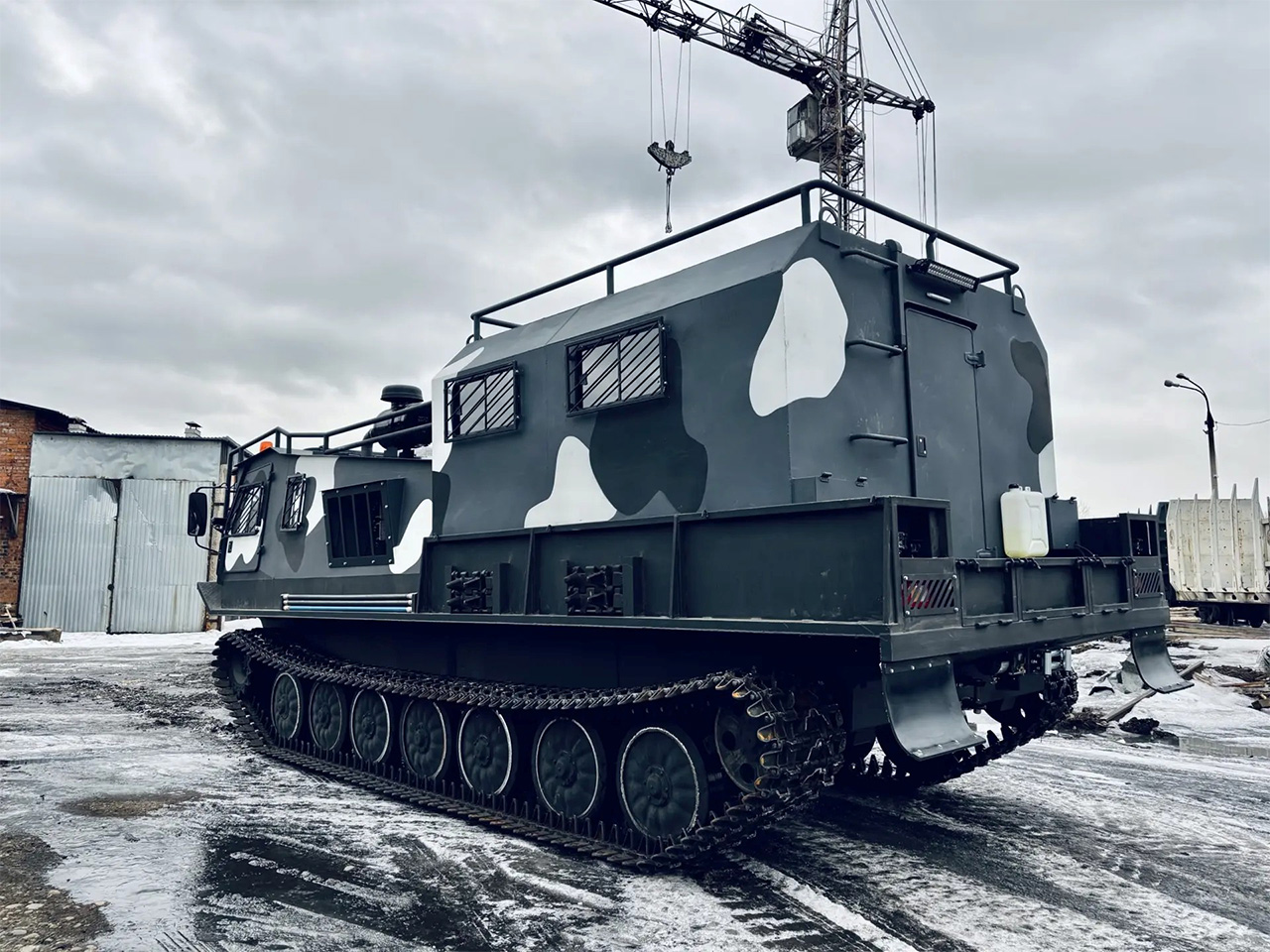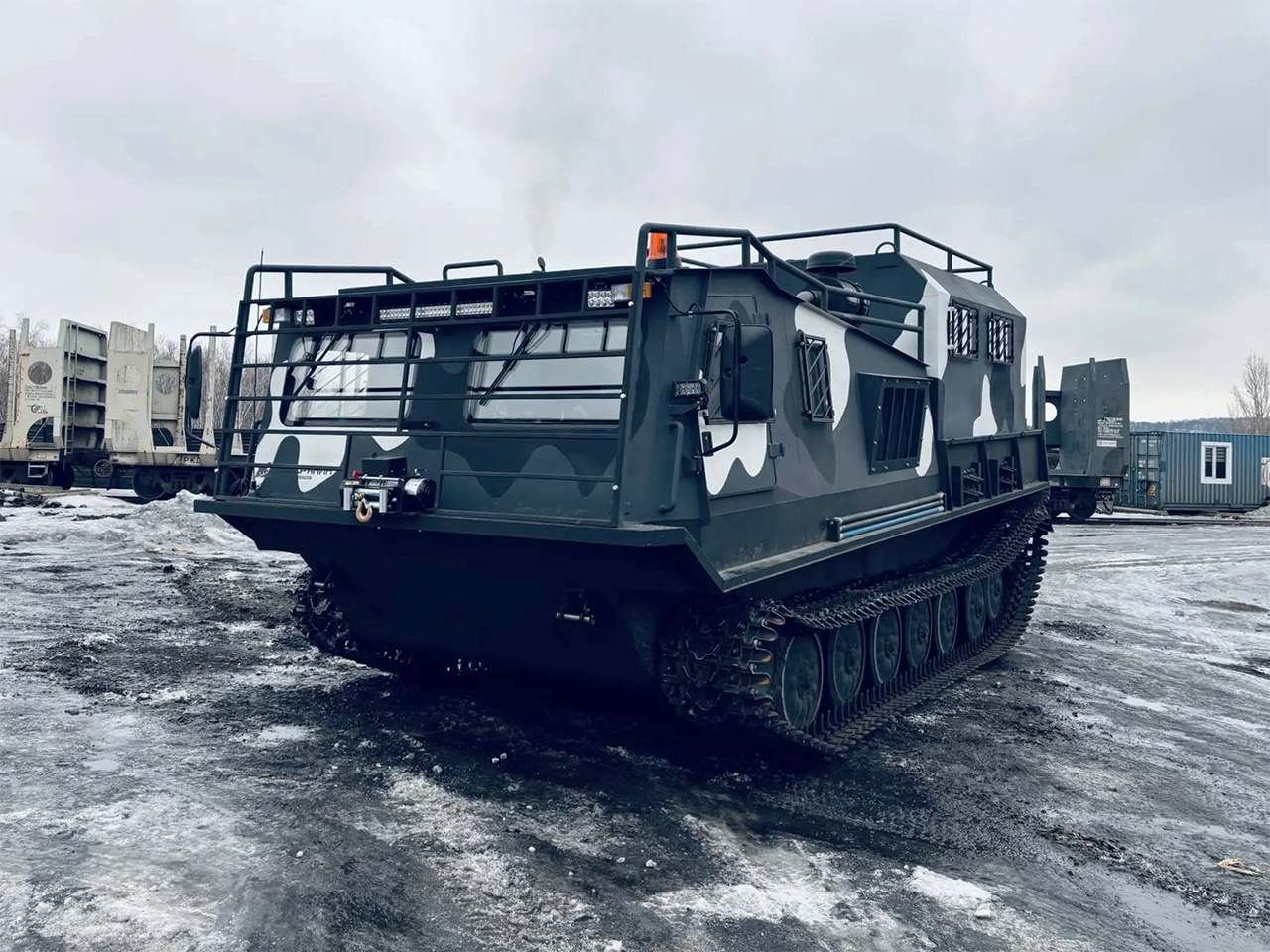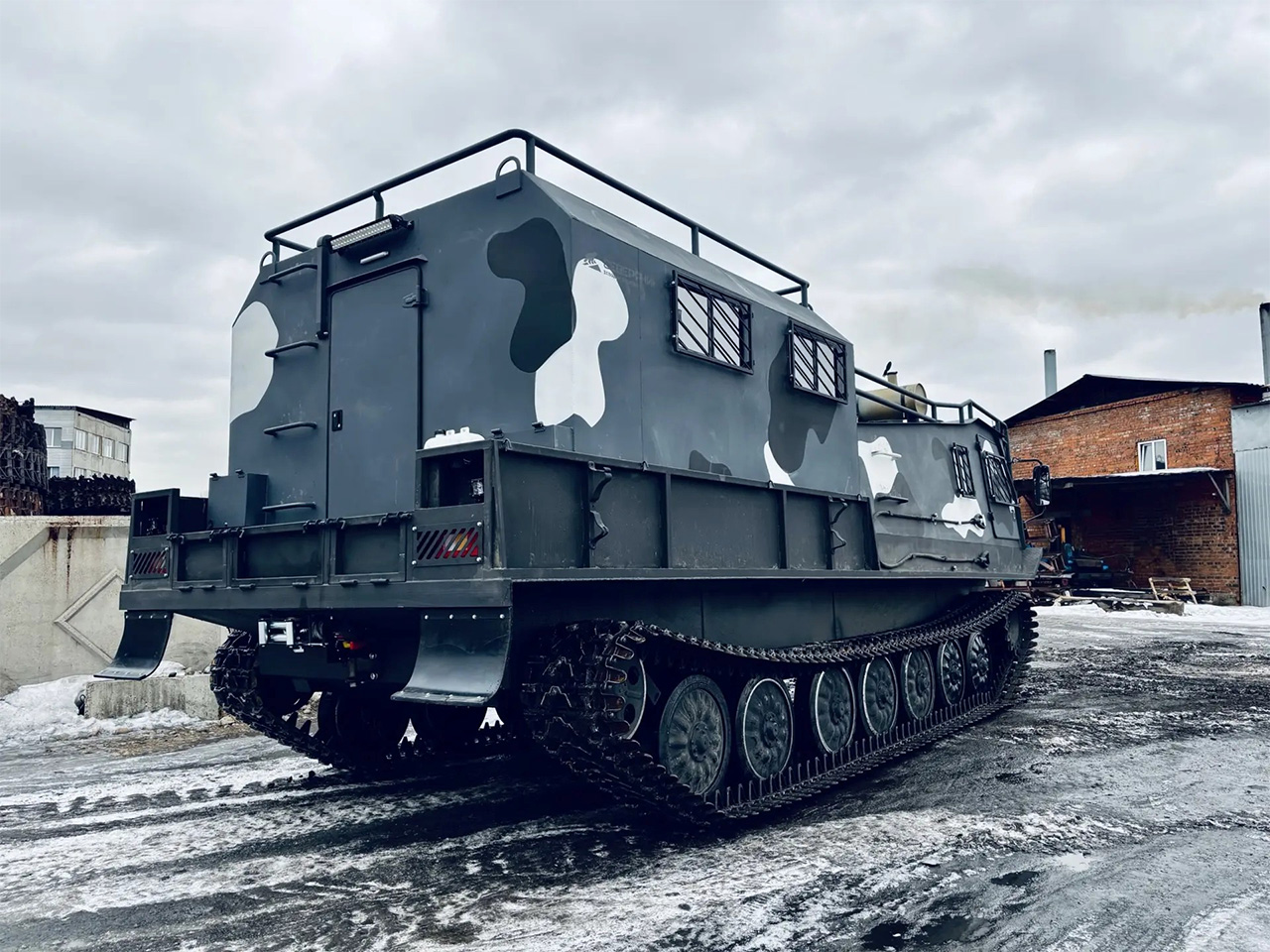 Модернизированный грузопассажирский вездеход на смену устаревшим армейским МТЛБу. Предназначен для перевозки людей и различных грузов в сверхтяжелых условиях бездорожья.